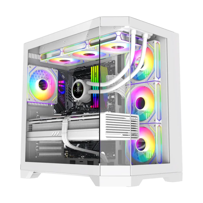 Поддерживает как воздушное, так и жидкостное охлаждение с отличными тепловыми характеристиками. Конструкция бокового приточного и заднего вытяжного воздуха для независимого блока питания обеспечивает эффективное охлаждение. Беспрепятственный поток воздуха снизу вверх обеспечивает быстрое рассеивание тепла, обеспечивая стабильную работу компьютера.