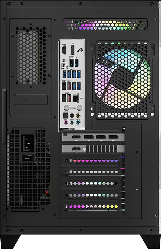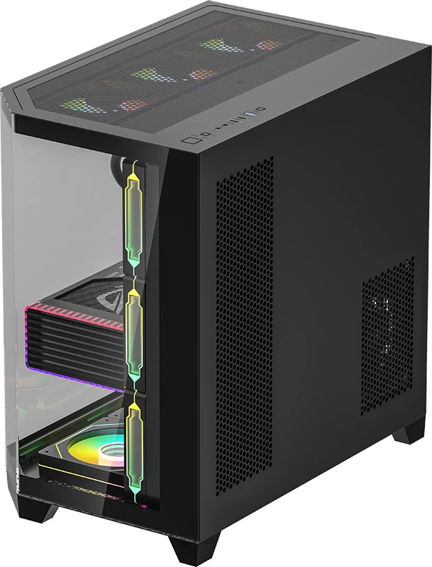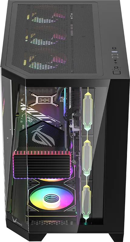 Продемонстрируйте сборку с элегантностью благодаря трёхсторонним панелям из закалённого стекла спереди, сбоку и на скошенной части, обеспечивающим широкий и чёткий обзор внутренностей ПК.