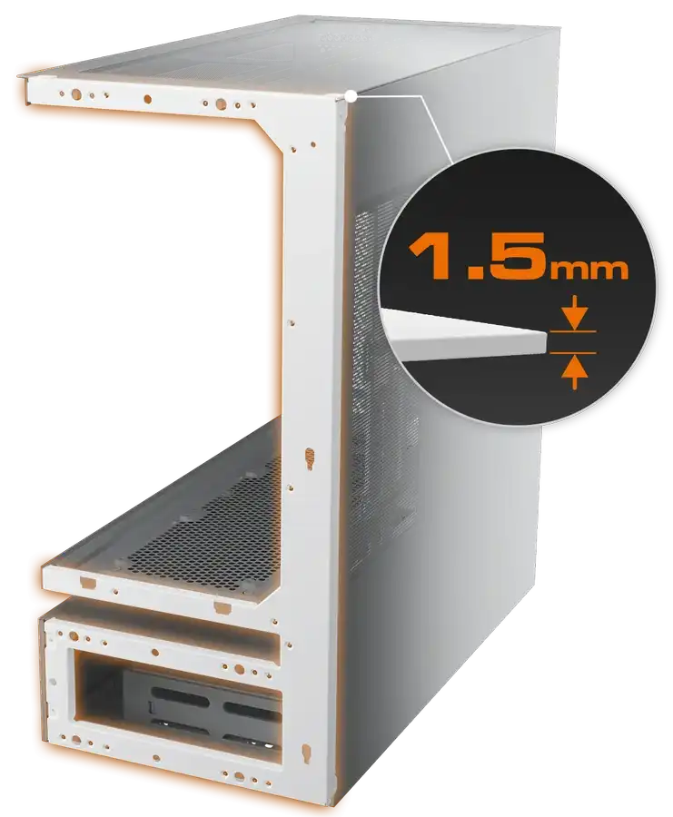 Стальной каркас толщиной 1,5 мм усиливает шасси, сохраняя структурную целостность даже при подвесной центральной системе вентиляции. В результате получается смелая, открытая архитектура, которая остается жесткой, надежной и готовой к использованию в высокопроизводительных системах.