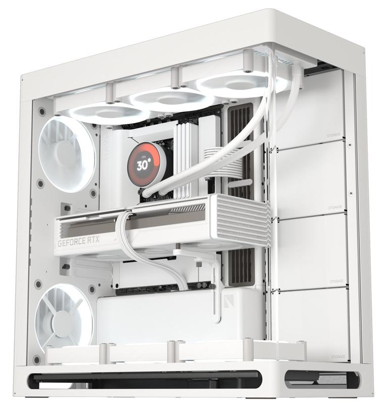 В гибридной конструкции HAVN графический процессор занимает центральное место, будучи полностью открытым за панорамным стеклом UniSheet. Такая конструкция оптимизирует воздушный поток для графического процессора и выделяет наиболее важные компоненты.