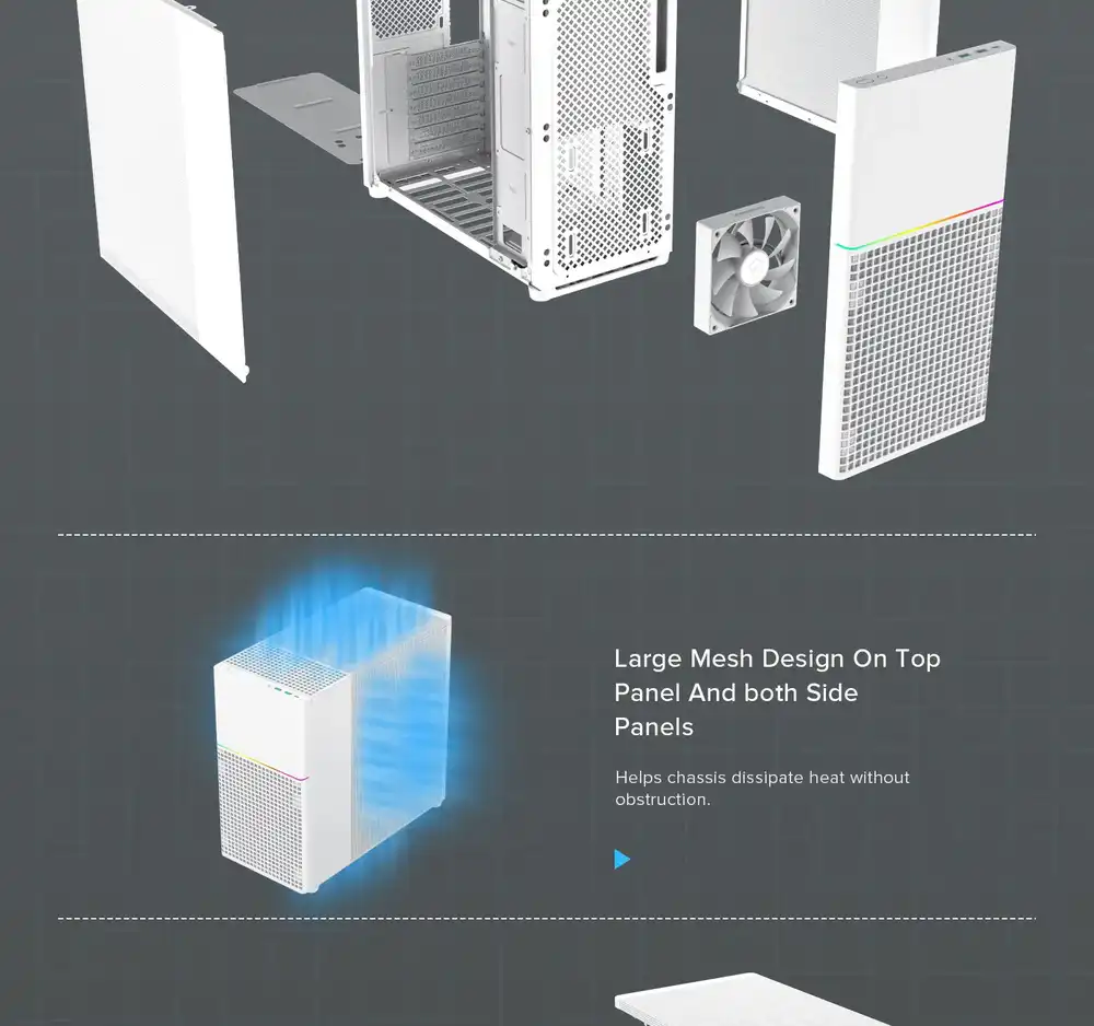 Компактный и стильный корпус форм‑фактора Mini‑ITX / Micro‑ATX, созданный для сборки небольших, но производительных домашних, офисных или игровых систем. Белое исполнение корпуса подчёркивает аккуратный дизайн, визуально расширяет пространство и выгодно выделяет внутренние компоненты, особенно при использовании подсветки.