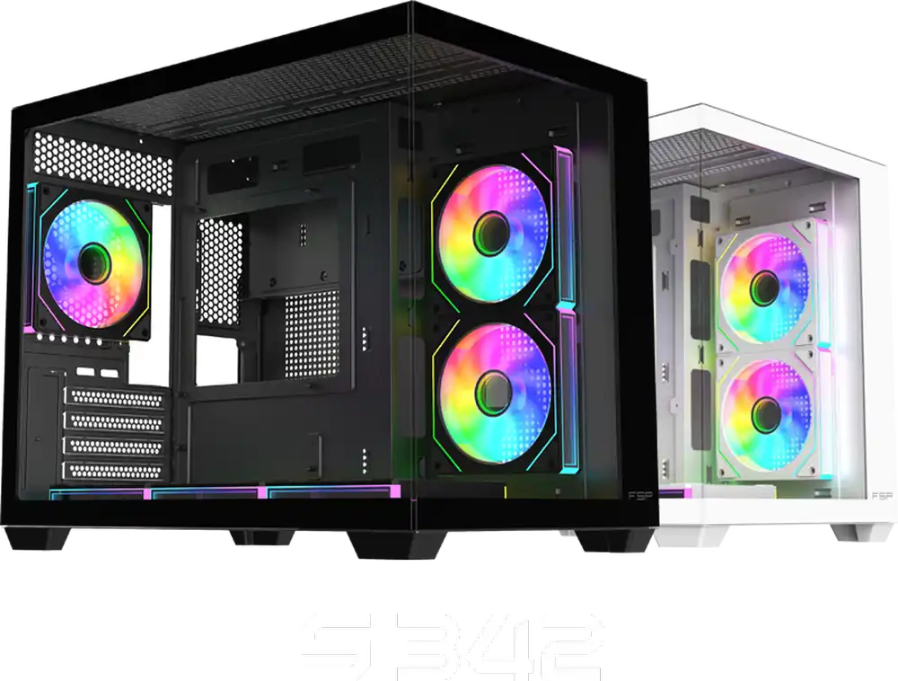 Двухслойная конструкция дисплея FSP S342 позволяет детально рассмотреть компоненты, а шесть вентиляторов обеспечивают мощный и равномерный воздушный поток. Несмотря на премиальный внешний вид, S342 демонстрирует бескомпромиссную теплоотдачу для высокопроизводительных сборок.
