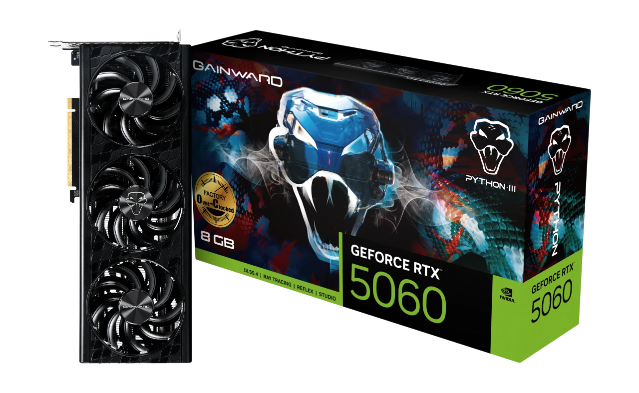 Видеокарта Gainward GeForce RTX 5060 Python III OC (NE75060T19P1-GB2063T) [8 ГБ, GDDR7, 128 бит, HDMI, DisplayPort (3 шт)]