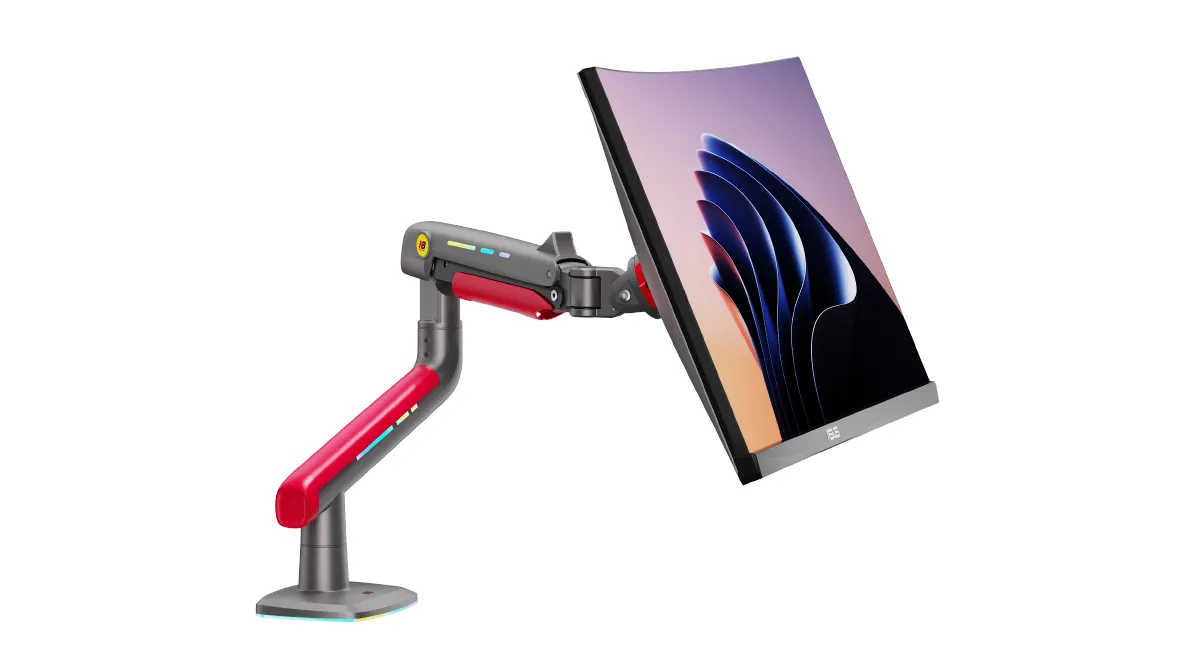 Кронштейн позволяет настраивать положение монитора в любом направлении: наклон от -50° до +50°, поворот на 180° в горизонтальной плоскости и полный разворот на 360° в режиме портретной или альбомной ориентации. Максимальный вылет вперёд — 63 см, а высота подъёма — до 50 см. Встроенный USB-порт и кабель-канал помогают организовать рабочее пространство без лишних проводов, а стильная RGB-подсветка с 14 режимами создаёт эффектную атмосферу в игровом или рабочем месте.