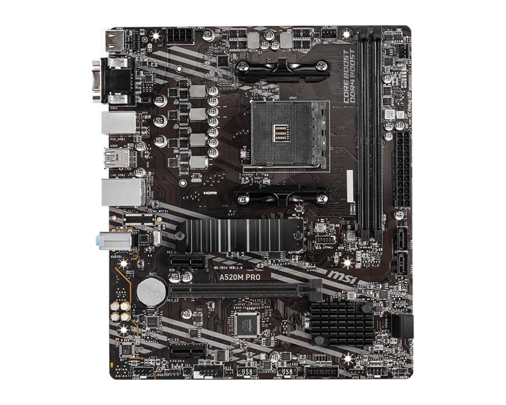 Материнская плата MSI A520M PRO, AM4, AMD A520, 2xDDR 4, 1xM.2, 1xPCI-E x16, Micro-ATX