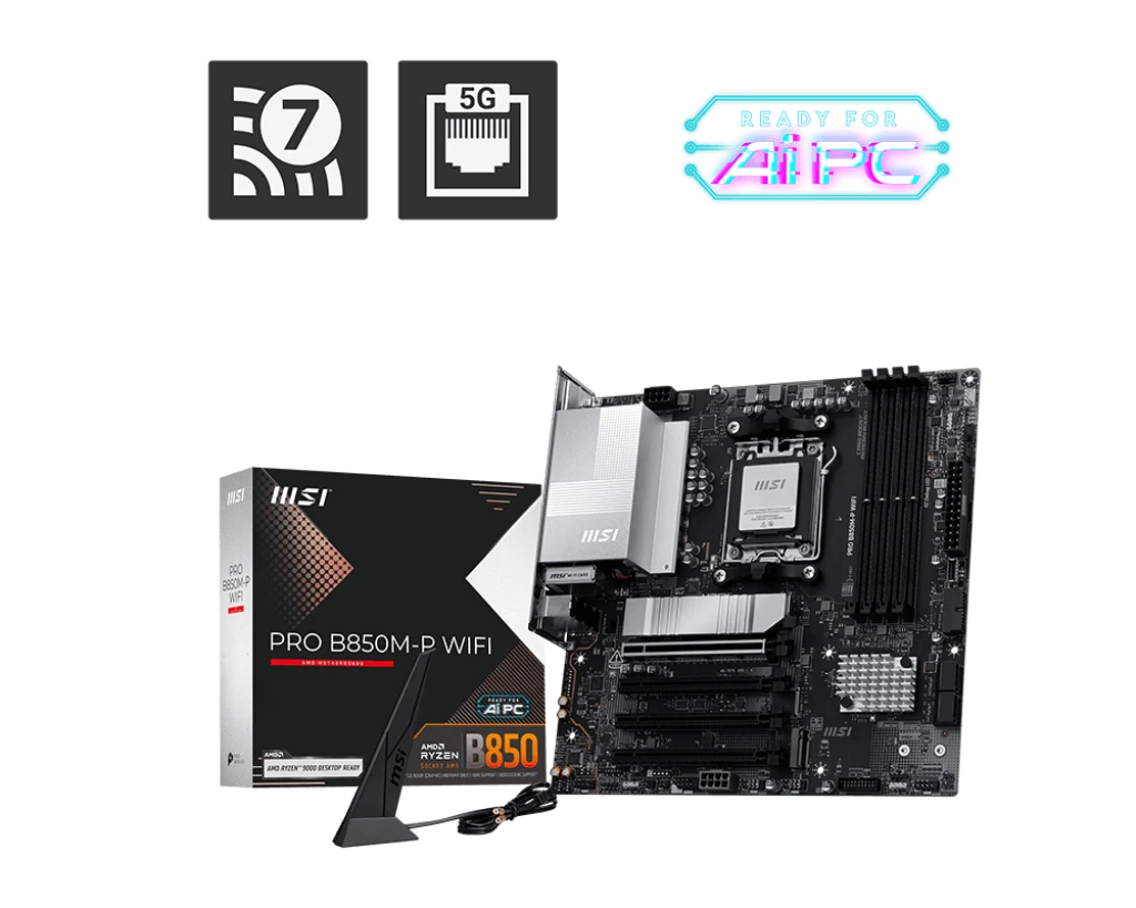 PRO B850M-P WIFI выполнена в простом дизайне с гармоничной серебристой цветовой схемой, которая отлично сочетается как с белыми, так и с чёрными сборками. Плата оснащена эксклюзивными технологиями MSI: Wi-Fi 7 с антенной EZ, сетевым интерфейсом 5G LAN, слотом PCIe 5.0 M.2 с радиатором EZ M.2 Shield Frozr II и дополнительным питанием для слота PCIe. Совместима с процессорами AMD Ryzen 9000 серии.