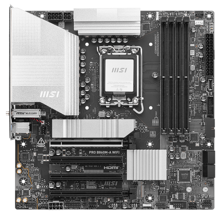 PRO B860M-A WIFI предлагает простой дизайн с гармоничной серебристой цветовой схемой, которая идеально подходит как для белых, так и для черных сборок ПК. Она оснащена эксклюзивными функциями MSI: Wi-Fi 7 с EZ Antenna, 5G LAN, Thunderbolt 4, PCIe 5.0 M.2 и дополнительным питанием PCIe. Материнская плата готова к работе с процессорами Intel® Core™ Ultra.