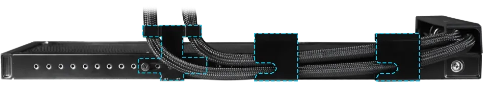 Инновационная конструкция боковых трубок позволяет расположить их вдоль края радиатора, значительно уменьшая визуальное загромождение. Кабели насоса и USB-насоса незаметно спрятаны в тканом чехле трубок, интегрированном в боковую часть радиатора, создавая эффект «практически беспроводного и бескамерного» радиатора.