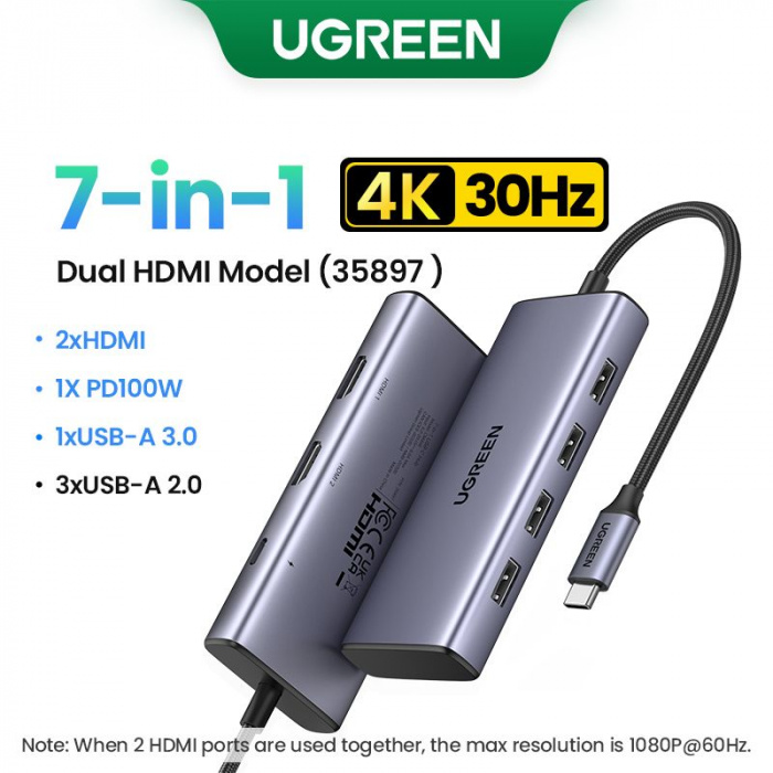 Хаб также поддерживает зарядку ноутбука мощностью 100 Вт через Type-C порт, что обеспечивает быструю и удобную зарядку дома, в офисе или в дороге. Один из HDMI-портов поддерживает видео до 4K при 30 Гц, а при подключении двух мониторов можно выводить изображение в разрешении 1080P при 60 Гц.