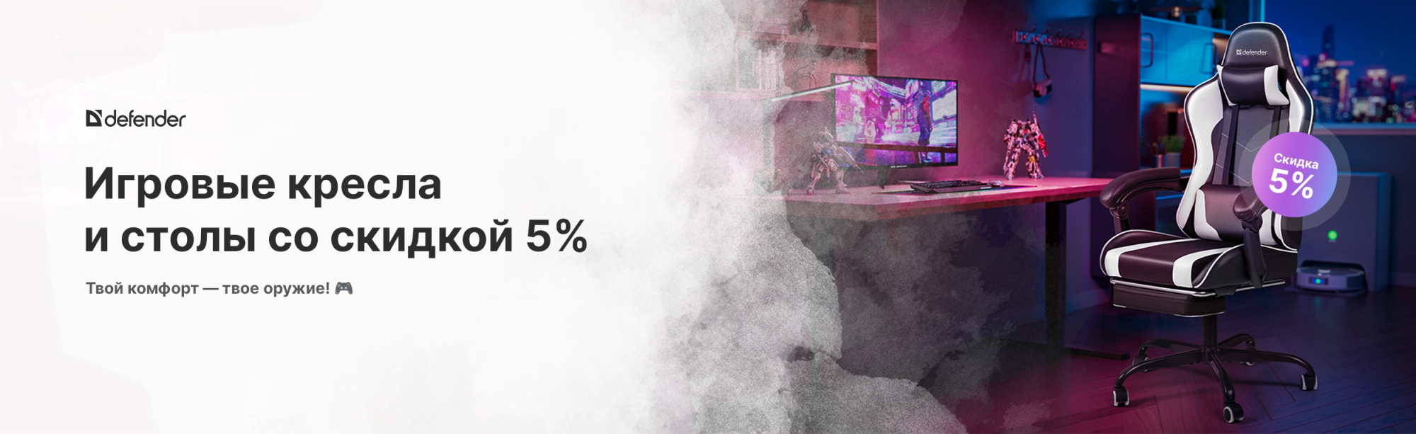 Только сейчас действует акция — скидка 5% на игровые кресла и столы Defender. Это отличная возможность обновить своё игровое и рабочее пространство, сделав его максимально удобным, современным и стильным.