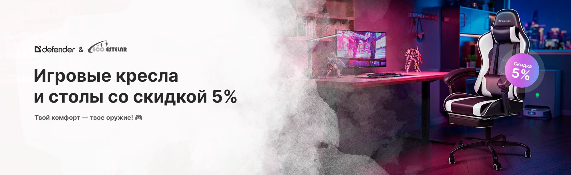 Только сейчас действует акция — скидка 5% на игровые кресла и столы Defender и Eco Estelar. Это отличная возможность обновить своё игровое и рабочее пространство, сделав его максимально удобным, современным и стильным.