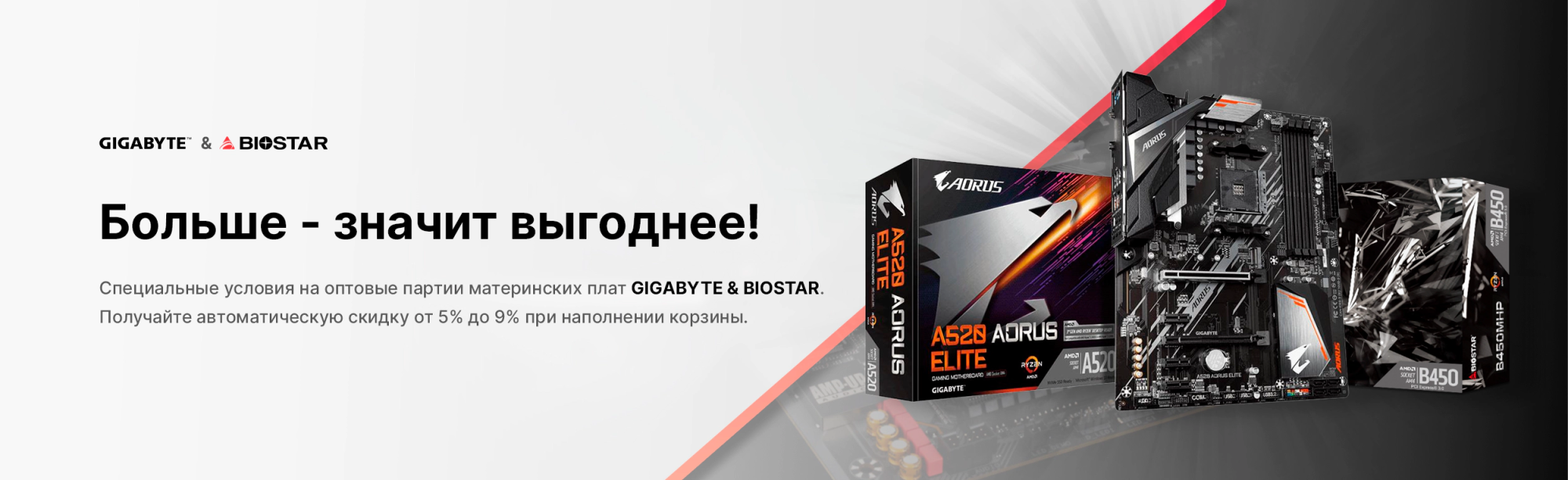 Мы предлагаем специальные условия для оптовых заказчиков. Теперь при закупке партий материнских плат GIGABYTE и BIOSTAR вы получаете прямую выгоду без долгих согласований. Цена снижается автоматически прямо в корзине при достижении порога по количеству каждой конкретной модели.